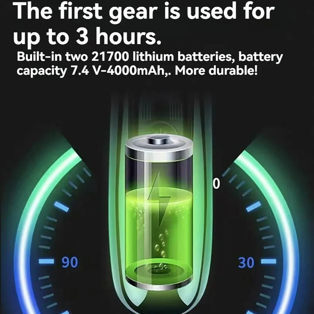 🔋 Långvarig strömförsörjning – Utrustad med dubbla polymerbatterier på totalt 3000mAh. Ger upp till 4 timmars drift på första nivån och har snabb laddning via Type-C.